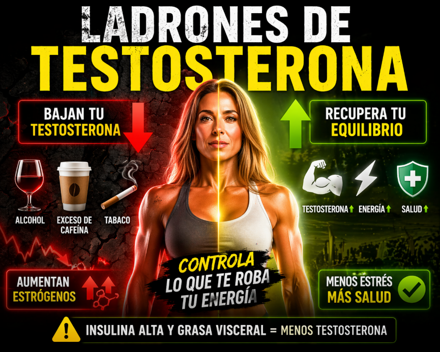Los llamados “ladrones de testosterona” no son solo conceptos abstractos, sino hábitos reales que muchas personas practican a diario sin ser conscientes de sus consecuencias. El alcohol, el exceso de cafeína, el tabaco, la resistencia a la insulina y la grasa visceral son factores clave que pueden afectar seriamente tu equilibrio hormonal.